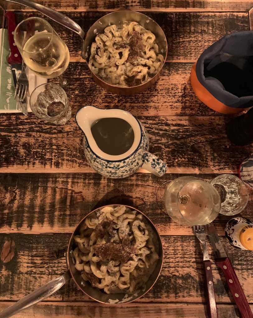 Nach dem gleichen Motto wie am Freitag, „Man gönnt sich ja sonst nichts!“, waren wir am Samstagabend italienisch essen. Angefangen mit der Vorspeise, einem wirklich leckeren Burrata mit frischem Brot, Olivenöl, Salz und Pfeffer, dem Hauptgang, die beste Trüffelpasta, die ich bisher gegessen habe (wirklich zum reinsetzen!!) und als wäre das nicht schon genug, als Dessert noch eine flambierte Crème Brûlée. Zu diesem Italiener werde ich auf jeden Fall auch nochmal mit meiner Mama gehen, wenn sie mich besuchen kommt.